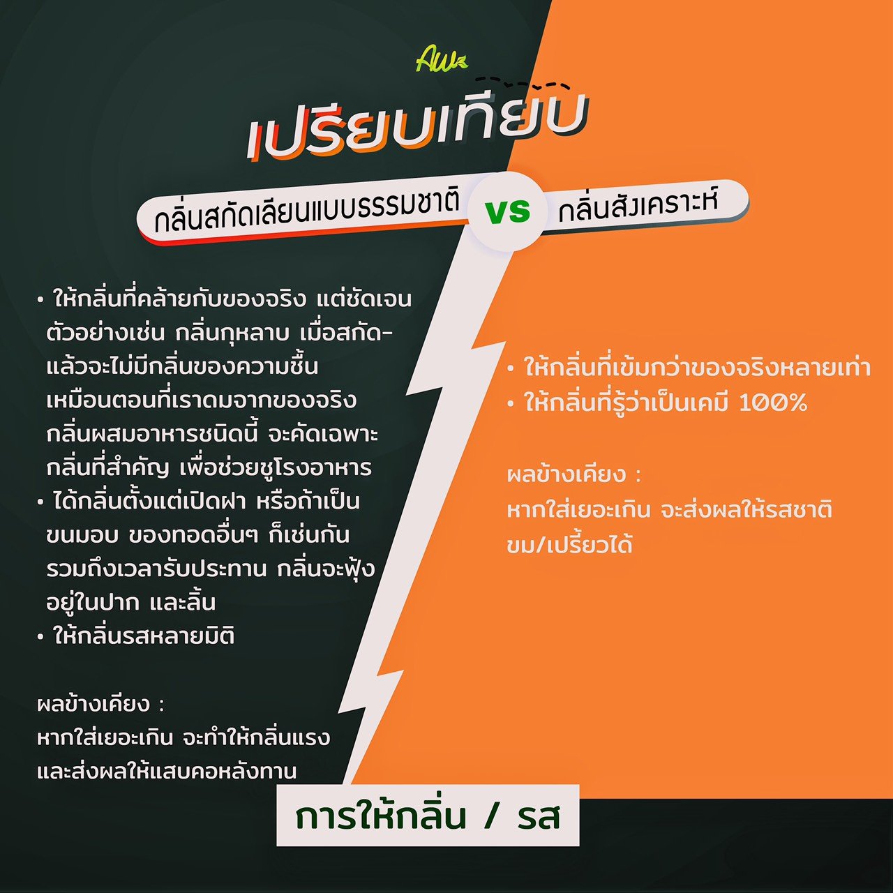 สวัสดีครับวันนี้เรามีสาระน่ารู้เกี่ยวกับกลิ่นผสมอาหารทั้งสองชนิด(ชนิดสกัดเลียนแบบธรรมชาติและชนิดสังเคราห์)สรุปโดยรวม5ข้อมาให้เห็นกันชัดๆเข้าใจง่ายว่าแตกต่างกันอย่างไร สำหรับผู้อ่านท่านใดที่กำลังต้องการใช้กลิ่นแต่ไม่รูู้ควรเลือกประเภทไหน บทความนี้มีคำตอบให้ไปดูกันเลยครับ